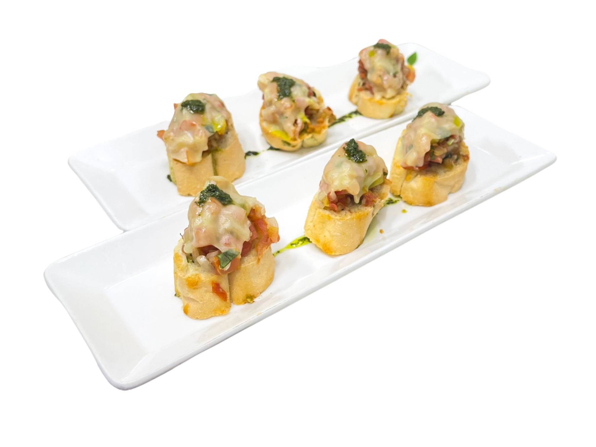 Deliciosa mezcla de tomates trinchados, cebolla, una pizca de comino, ajo y albahaca sobre 6 rebanadas de pan baguette gratinadas con queso gouda y un toque de salsa pesto
